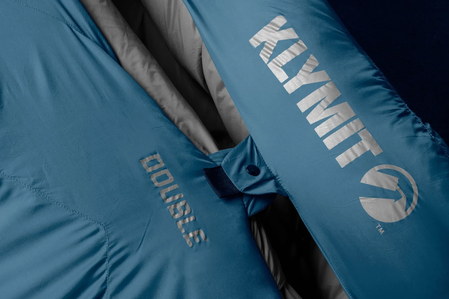 The Klymit Double Full-Synthetic Sleeping Bag perfect camping set up for two. It has plenty of room for two and is thoughtfully designed for three-season comfort. The sleeping bag’s versatility is made possible by its individual draft covers and hood snap, the two-way zipper running along each side and the synthetic insulation. The hood snaps creative two individual hoods to stop the draft between users and provides warmth in temperatures down to 30 degrees. The full zippers make it possible to partially or completely remove the top quilt on warmer nights under the stars.