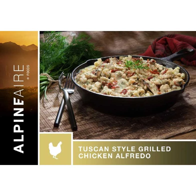 Savor rich, creamy sauce with spinach, tomatoes, chicken and pasta tagliatelle in the backcountry with AlpineAire Foods Grilled Chicken with Spinach Alfredo as fuel for your adventure.