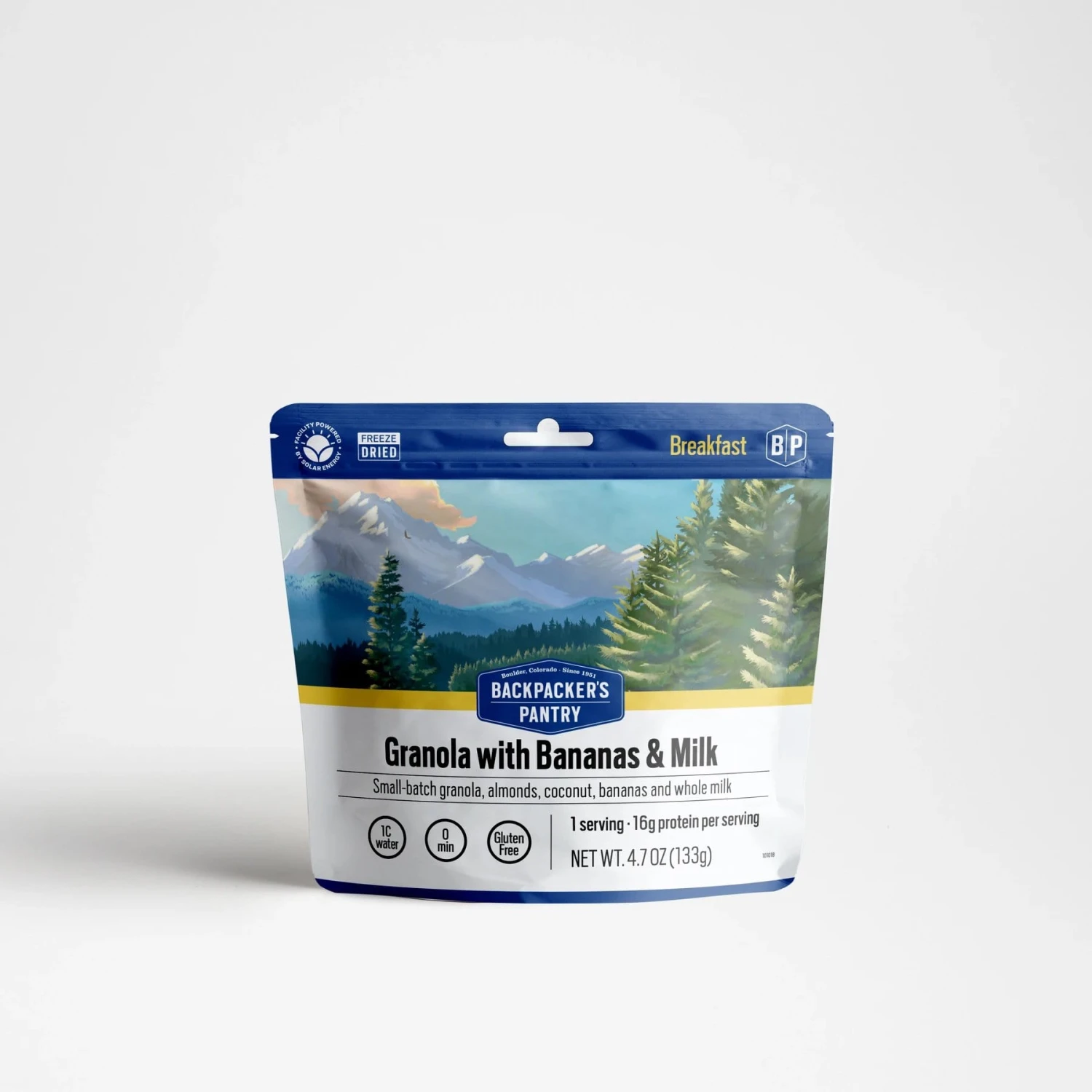 Artisan, small batch granola made just for Backpacker’s Pantry is combined with nutritious almonds, banana chips & rbst-free whole milk for a calorie dense, satisfying and great tasting breakfast on the trail. A local granola company hand bakes the base with real butter, almonds & coconut. Backpacker’s Pantry adds the rbst-free whole milk powder and free-dried bananas. This is a favorite of all ages. Backpacker’s Pantry Granola with Bananas, Almonds & Milk for two needs only 1 cup of cold water & a good stir or shake. Try hot water if you are more partial to a hot breakfast cereal on a cold day. High-protein, high-calorie & super tasty this will become you go-to breakfast on the woods, on a mountain or in a boat. No need for a carton of milk, this is the ideal emergency meal too. It’s lightweight and convenience makes it ideal for travel too. You don’t need to leave your sleeping bag or hotel room to have a great breakfast.