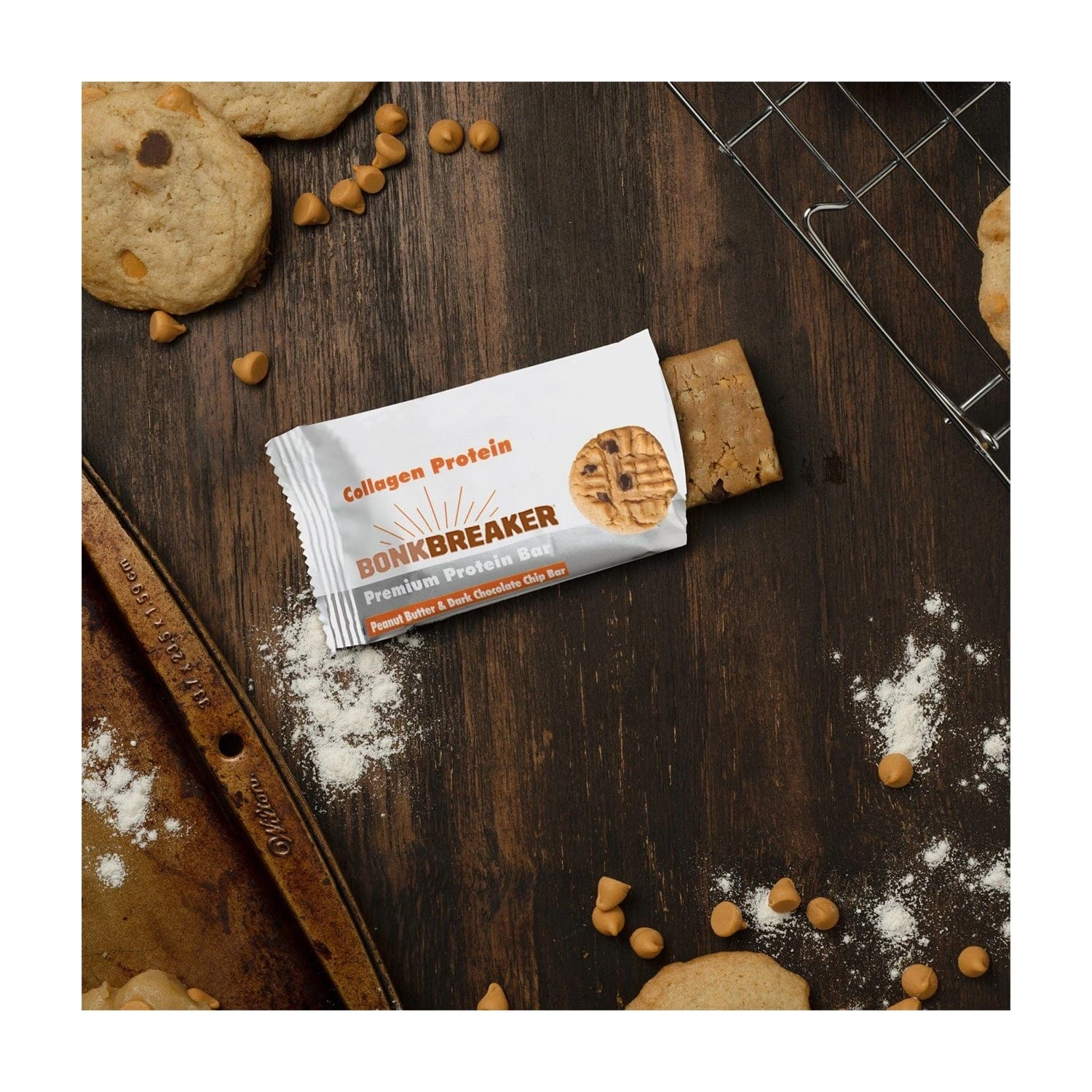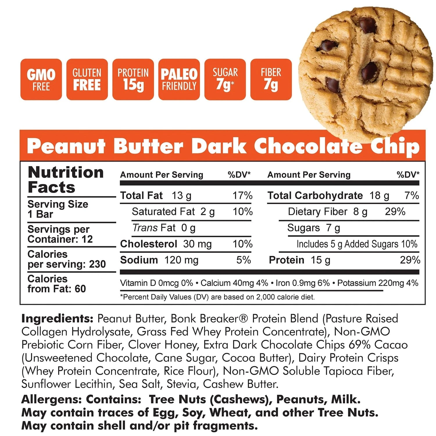 To say Peanut Butter and Dark Chocolate Chips are a perfect pair would be an understatement! This flavor-packed, dynamic duo has been fueling the likes of World Champion Triathletes & Cyclists, Pro Bowl Football players, Celebrity Fitness trainers and Weekend Warriors for years, and now its here to take protein to the next level with 15g of protein and only 7g of sugar in a deliciously, filling bar. All of our Premium protein bars are made with all-natural, REAL ingredients that are Gluten-Free, and feature the proprietary Bonk Breaker® Protein Blend of Pasture Raised Collagen Hydrolysate and Grass Fed Whey Concentrate.