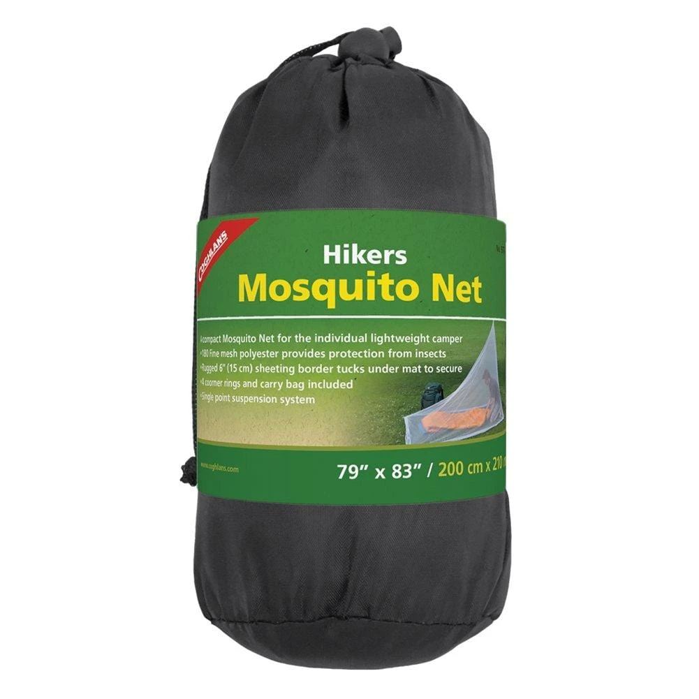 Lightweight and Compact knitted polyester netting with one suspension point is perfect for backpacking. Four corner rings along the bottom for securing with 6 in. border to tuck under sleeping bag or pad. 6 ft. 6 in. height x 6 ft. 11 in. length x 4 ft. 9 in. front – 3 ft. 3 in. back width. Color: White. Carry bag included.