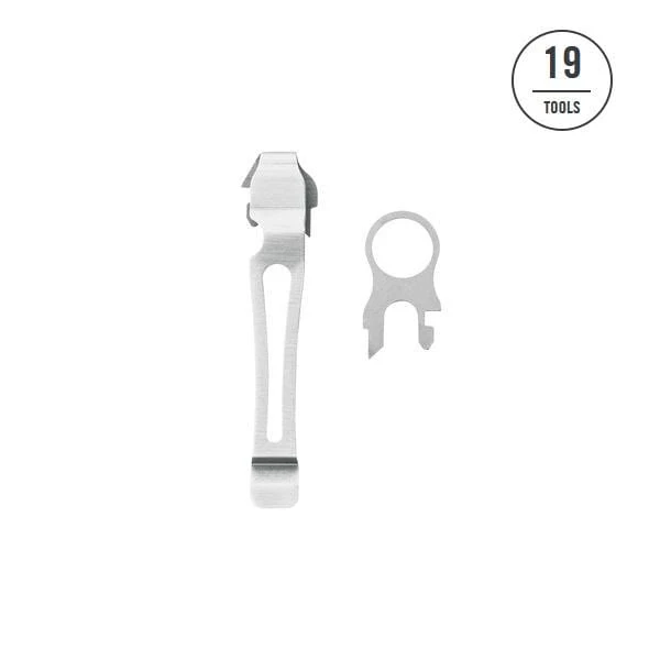 An accessory set that includes a removable clip, which allows the user to wear their multi-tool attached to a pocket or belt loop, and a removable quick-release lanyard ring, which allows for attachment to a lanyard. Often people who work near water or on scaffolding attach their tool to a lanyard on their person to avoid losing the tool if it’s dropped.
