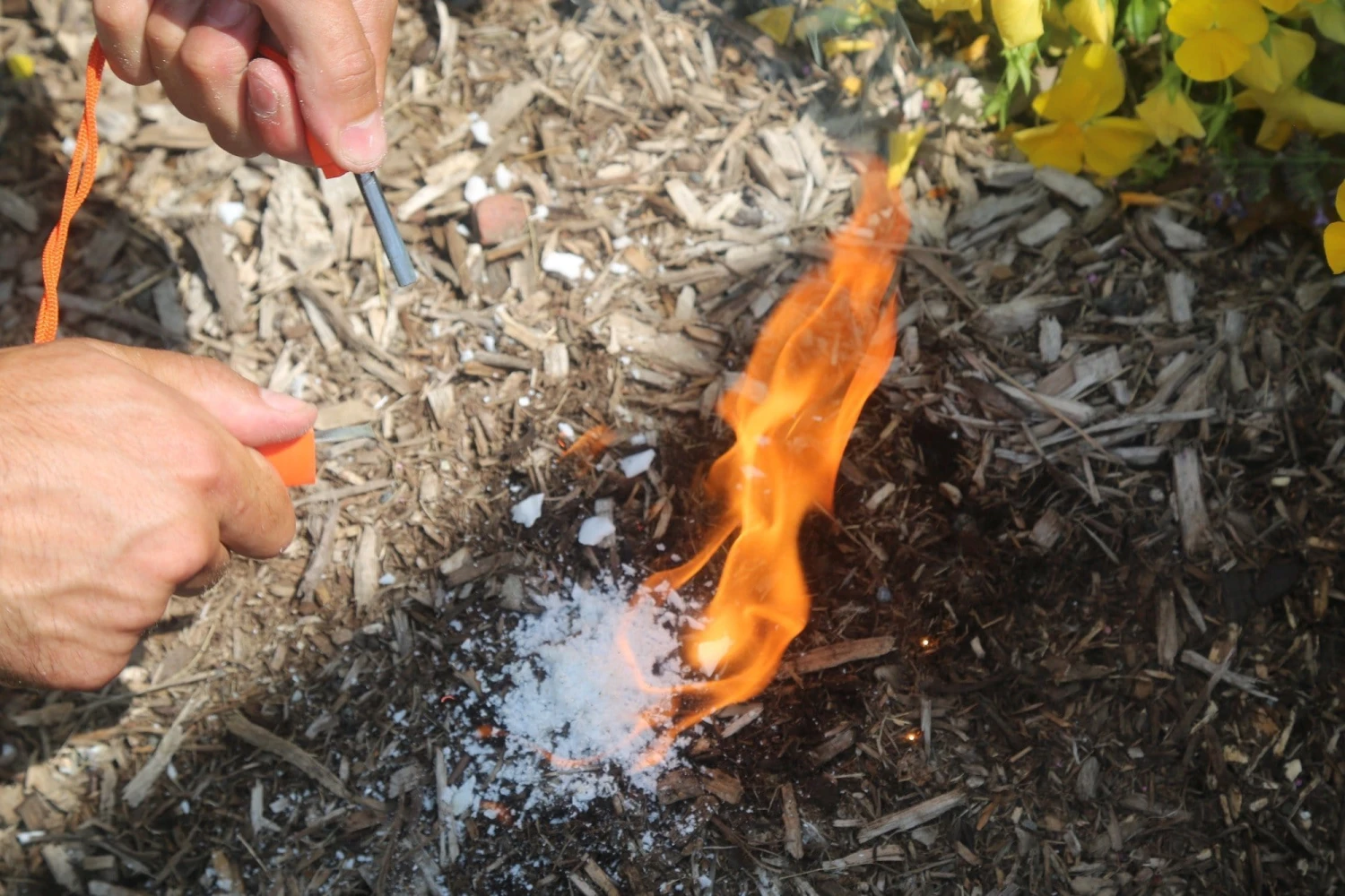 Step 3. Point the Striker Rod at the shaved pile of QuickSurvive Fire Starter.