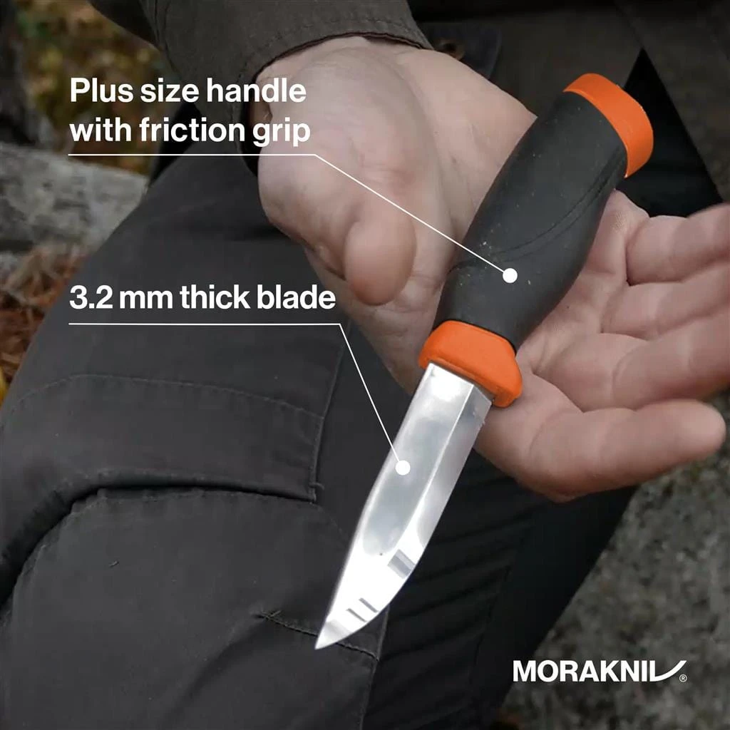 Morakniv Companion Heavy Duty Knife is a powerful tool for bushcrafters, hunters and outdoor people. If you need a knife that has great strength requirements, we recommend the Companion Heavy Duty with its three-layer injection molding and the slightly blunter edge angle of 27° for maximum sharpness retention (default is otherwise an angle of 23°). The knife has an extra-large ergonomic handle with a soft, high-friction grip. The knife has a blade of 0.125″ (3.2 mm) thick carbon steel with high-load capacity. The classic scandi grind combined with high-quality carbon steel makes the knife easy to resharpen. Plastic sheath with a belt clip.