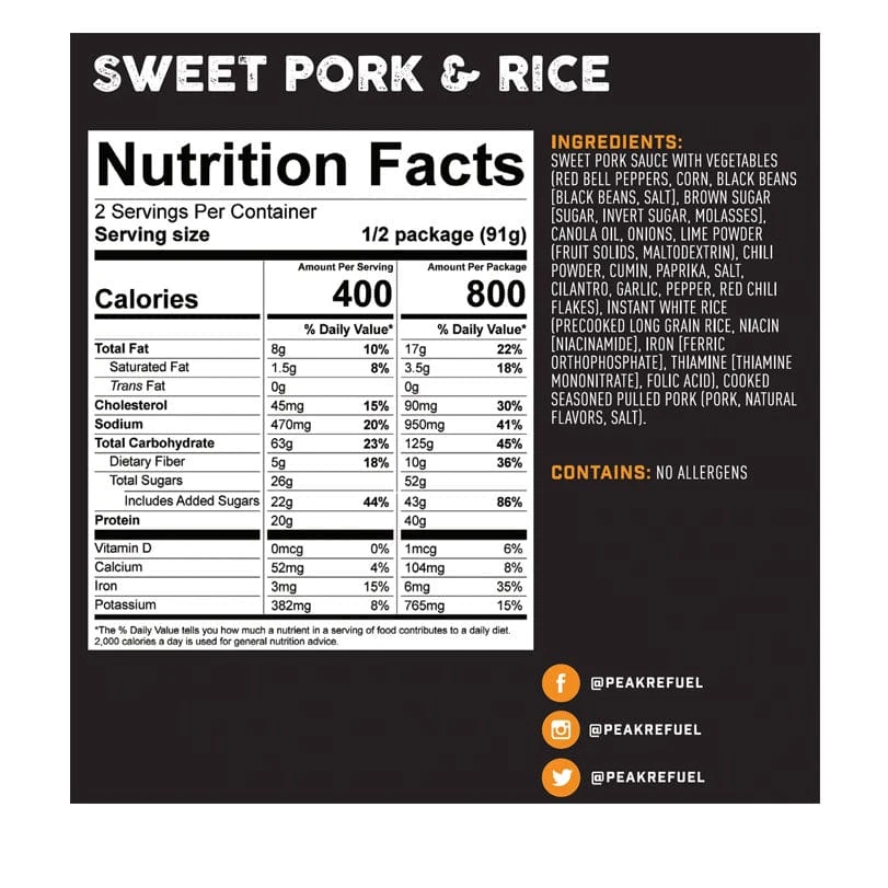 When it’s time to settle in by the fire, savor it sweeter with Peak Refuel’s Sweet Pork and Rice. With a kick of chili peppers, dive into this medley of tender pulled pork, white rice, black beans, veggies, and a dash of cilantro and spices. Oh, and did we mention our pork is made of, well, pork? We steer clear of fillers or artificial additives to give you the elevated meal you deserve after a long day outdoors. Recharge with 40 grams of protein, 50% of your daily iron, and 20% of your daily potassium and can get back up the next day to start out like it’s day 1.