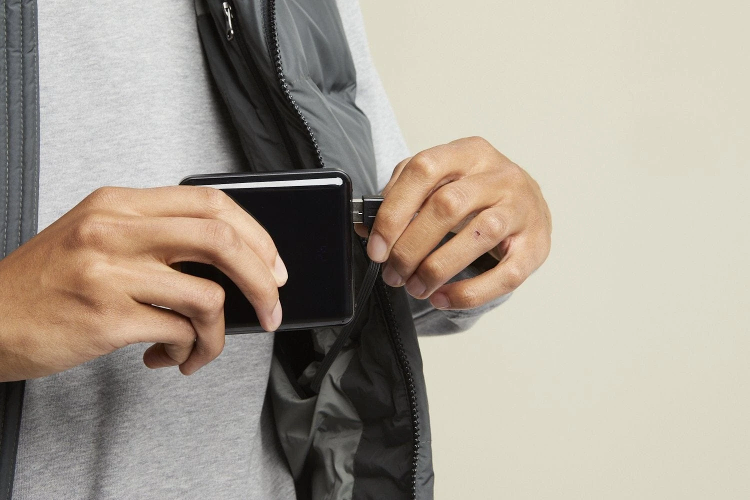The latest generation of our power technology, designed to keep you warm all day. With the PWR5 plugged in, you will never leave home without a source of energy to power your jacket or mobile devices. This power bank is the fastest charging battery we have ever developed and optimally designed to be used with the following Kelvin coats: Sol and Apollo.Â