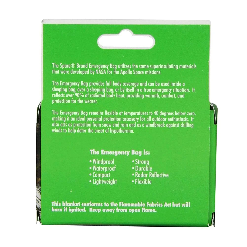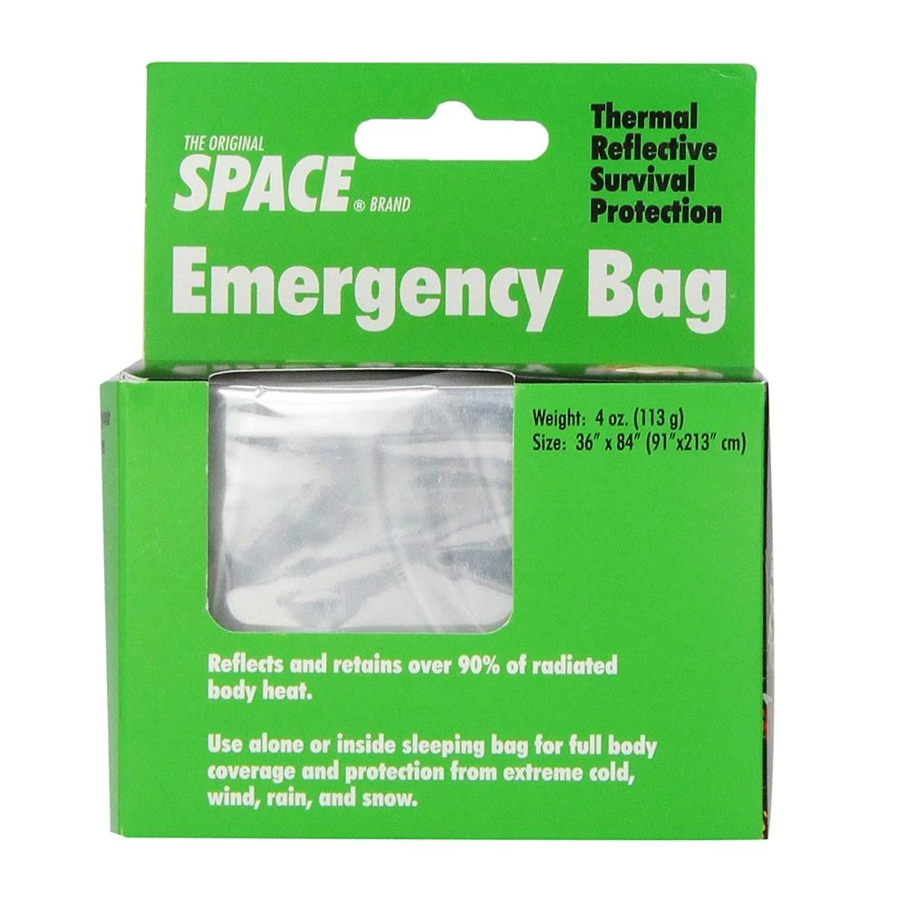 The Original SPACE Emergency Bag reflects and retains over 90% radiated body heat for maximum sedentary protection. Use as full body coverage when at rest, inside a sleeping bag, over a sleeping bag to keep out moisture, or in a true emergency situation. When folded it is approximately the size of a billfold, but opens to (36″x84″) 7’x3′ bag.