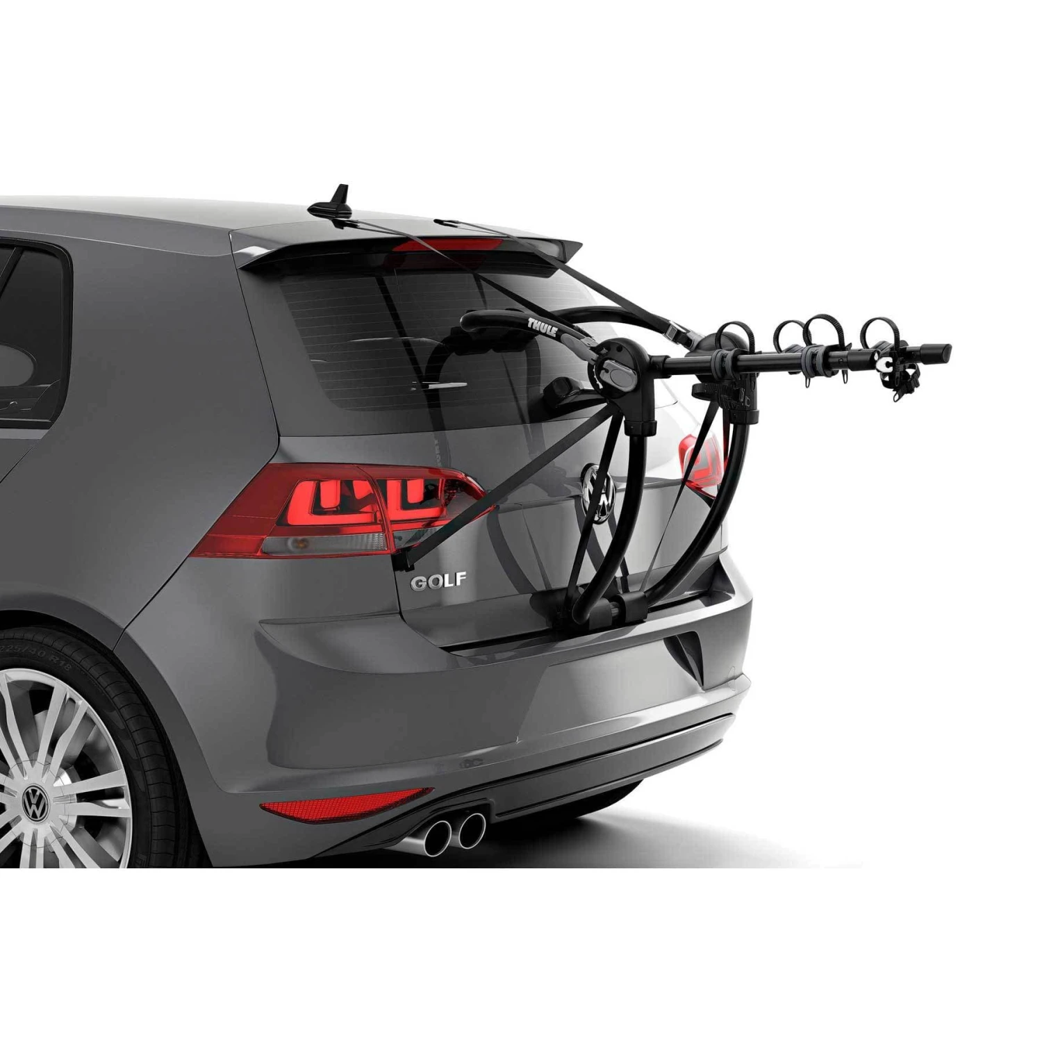 Robust trunk bike rack securely holds bikes, is easy to use, and folds for compact storage. The Thule Gateway Pro 2 Bike is an excellent trunk mounted rack with fully independent and adjustable arms versatile enough to carry different sized and styles of frames at once. The 2 anti-sway cradles and 7 inches of clearance between the bikes insures that no scratches will be made. The compact ratcheting cradle straps make it quick and easy to get your bikes in place. The access straps can be tucked away to prevent scratches on your car. This rack folds up flat for easy storage.