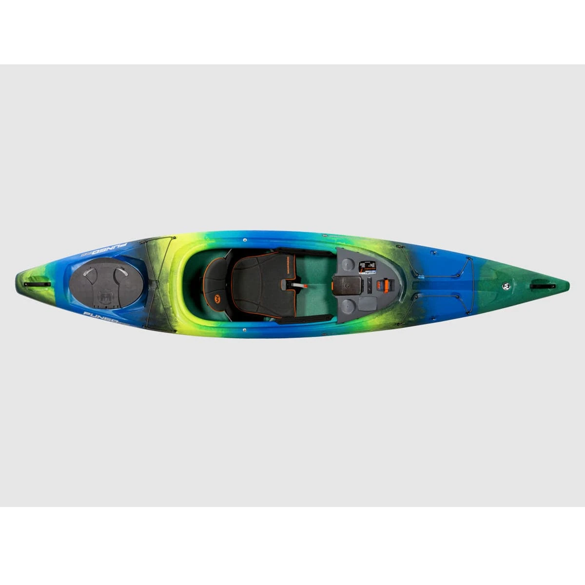 The patented Phase 3® AirPro seating system is the core of what makes Wilderness Systems the world’s most comfortable kayaks; the Pungo’s comfort and adjustability is built just for you, allowing you to be fully immersed in your on-water experience. The Pungo also integrates the most comprehensive kayak dashboard interface for optimal customization and features. It includes the removable DryTec dry box that allows you to take your valuables with you, two cup holders for your favorite beverage, a recess for the Wilderness Systems Lithium Battery (sold separately), SlideTrax ™ to hold mounts for phones, fishing rods and other accessories, and two mounting platforms for customized accessorizing. A protective and replaceable skid plate, comfortable rigid carry handles, industry-leading storage capabilities, and configurable deck bungee rigging rounds out a robust list of attributes.Â