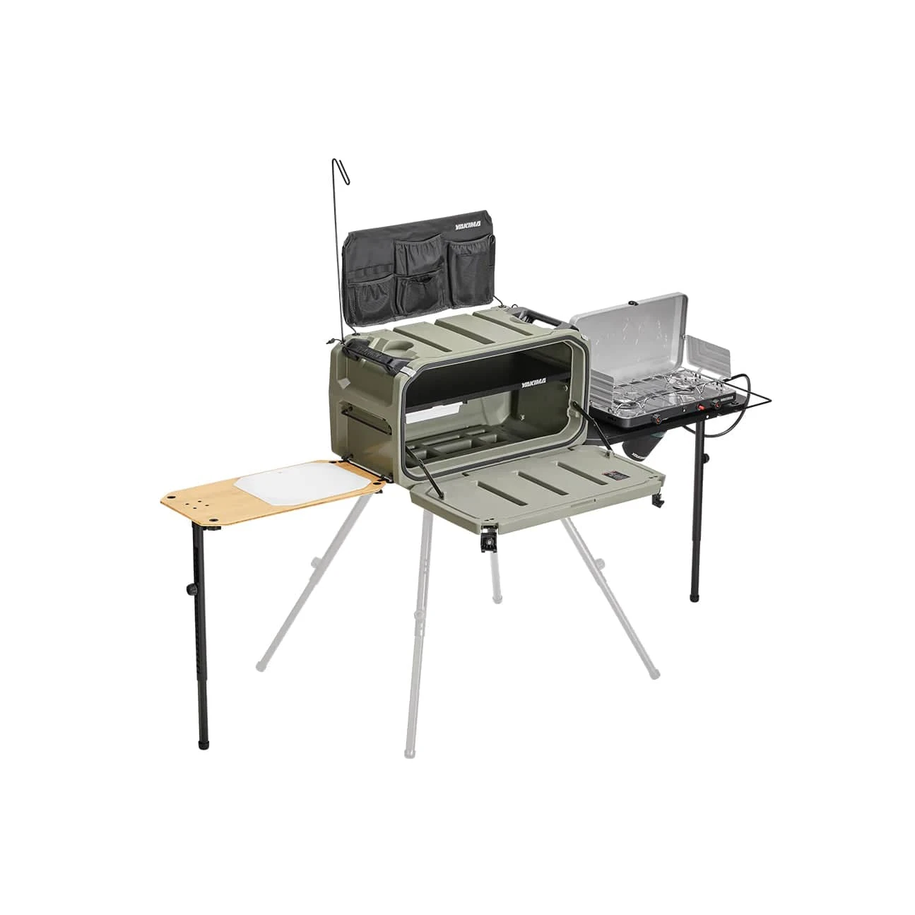 Go deluxe with all the options. Organize and stow your camp kitchen gear with this all-in-one system, simplifying your effort so it’s always ready to grab-and-go. The rugged, road-worthy box can seamlessly attach to the EXO System for smooth transport to your campsite, trailhead or ball game. Or take this cooking station anywhere with the OpenRange Leg Kit, 8007449. With the included side tables and 2 burner stove, quickly build it up and turn it into a fully functional work station, making it easy to prep, cook, and serve from the same spot.Â